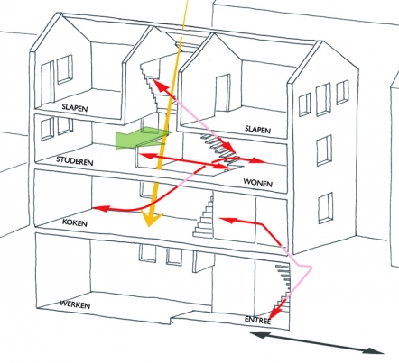 The thrust of the design is carried by an open, three-storey-high space in the heart of the building. This intervention connects the three upper floors creating direct spatial relationships between the various living areas. The new window in the north elevation allows daylight to stretch deep into the building while simultaneously opening the interior to the open space within the block. A new rooflight allows direct sunlight to penetrate all three floors.